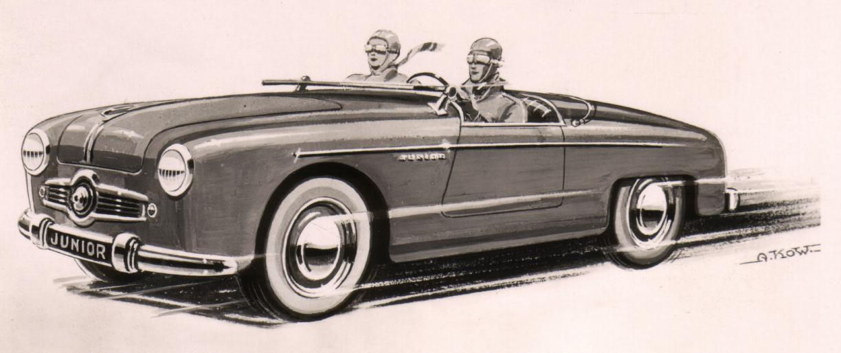 Panhard besluit deze Junior in serieproductie te brengen. En Kow maakt er alvast, voor een nooit verschenen folder, een mooie tekening van:
