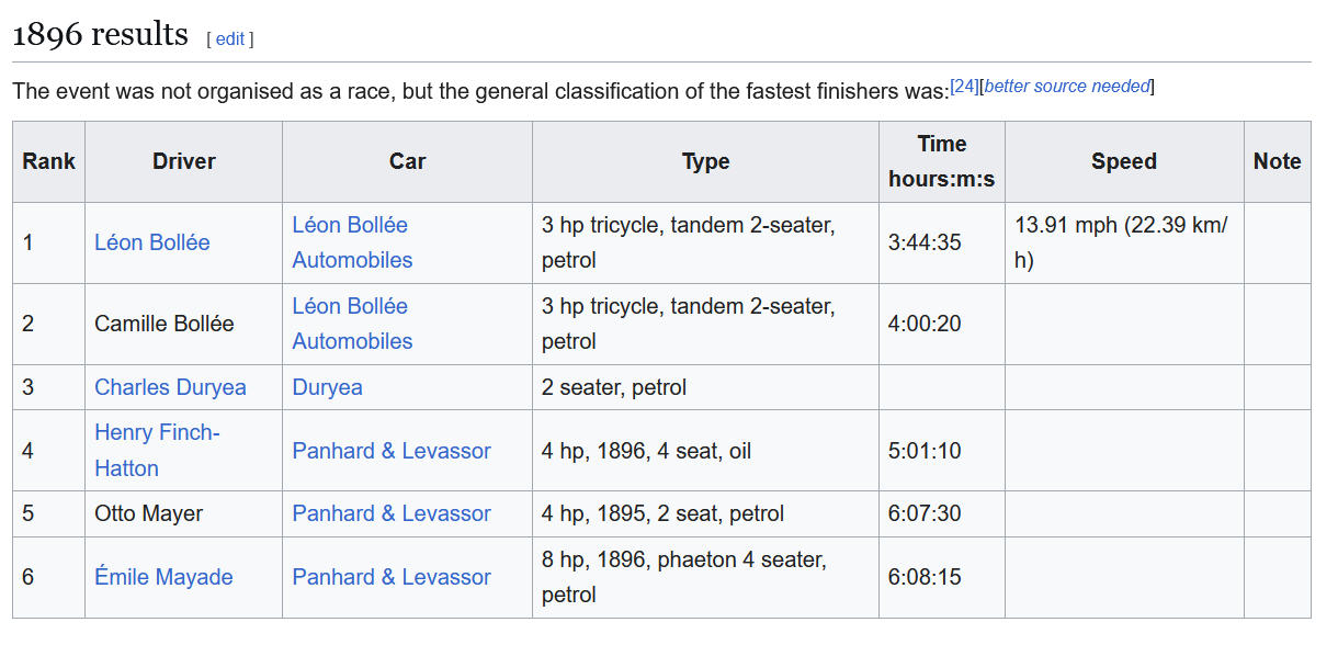 - Eén van de zeven ingeschreven Daimlers eindigde op de zevende plek. Volgens Mecedes Benz werd deze auto door ene Van Toll gereden, de door Frederick Simms and Gottlieb Daimler gereden Daimler Barouche heeft de eindstreep dus niet gehaald.